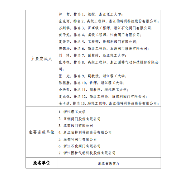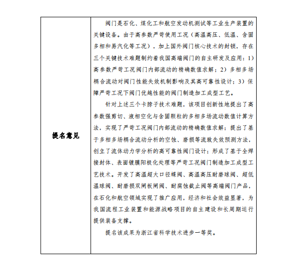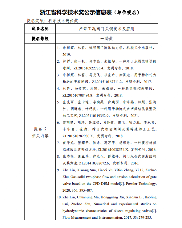 根据《浙江省科学技术厅关于开展2021年度浙江省科学技术奖提名工作的通知》要求,现对我单位拟参与申报的浙江省科技奖励项目“严苛工况阀门关键技术及应用”予以公示,公示期7天(2022年2月26日至2022年3月4日)。