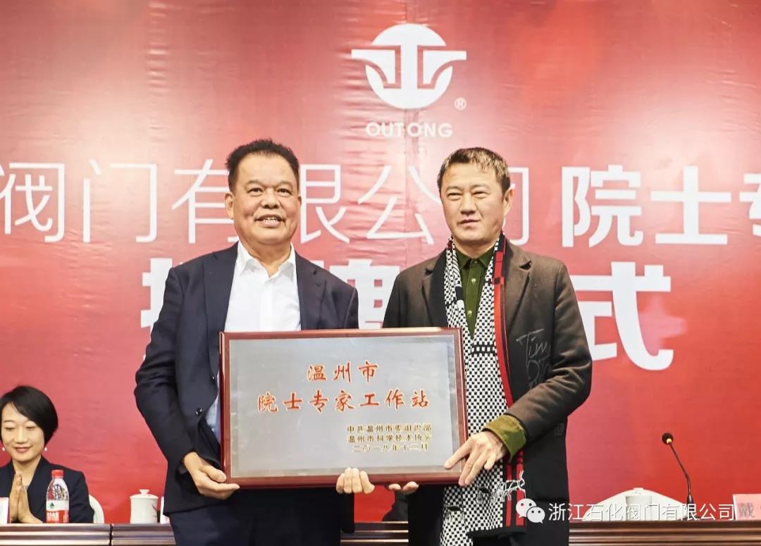 温州市科协副主席戴维文向开云·体育-开云(中国)一站式服务官方网站_开云体育官方网站 董事长杨荣水先生颁授“院士专家工作站”牌匾,开云·体育-开云(中国)一站式服务官方网站_开云体育官方网站 总经理杨选荣向中国工程院陈学东院士颁发聘书,就此,院士工作站正式建站。