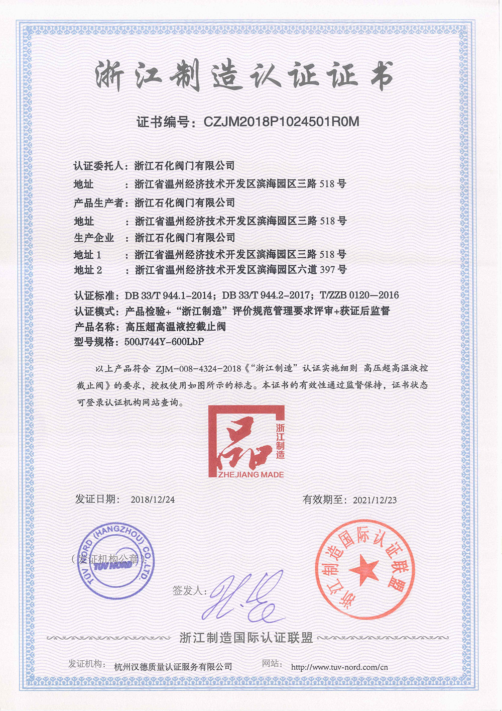 我公司于2018年12月通过了《高压超高温液控截止阀》的浙江制造认证证书,为了深入推进“三强一制造”建设,打响“品字标浙江制造”品牌,浙江制造推行了“品字标”企业“四个百分百”计划,努力实现“品字标”企业厂区车间100%亮标、质量承诺100%公示、品牌产品100%贴标、广告宣传100%植入,以此不断提升“品字标”品牌的社会知名度、认可度和美誉度。
