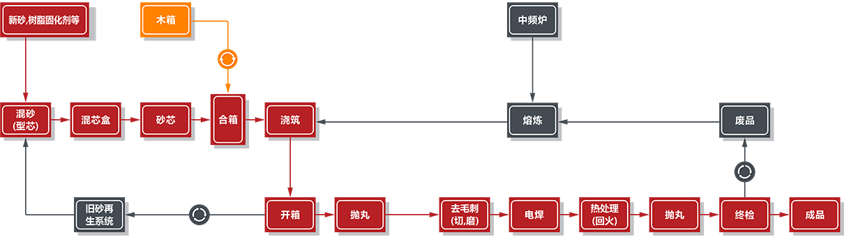 公司产品采用先进的碱性酚醛树脂砂生产工艺,配备有中频炉6吨1台、3吨2台、1吨1台,50吨和20吨天燃气热处理炉各一套、10吨电阻热处理炉2台。配备有现代化的检测和材料试验设备:直读式光谱分析仪、金相分析仪、机械性能试验、低温冲击试验、MT、PT、UT、RT等完善的检测设备,由专职检验人员进行分析和检测,以确保客户对铸件质量的要求。